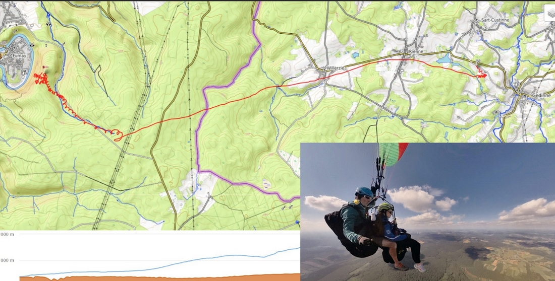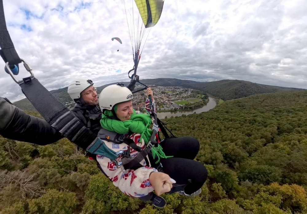 Bruno avec sa passagère au dessus de notre forêt Ardennaise (Fumay en arrière plan)