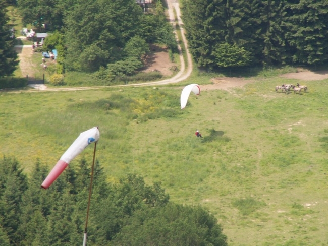 Prairie longeant la Semois avec manche à air, visible du décollage.